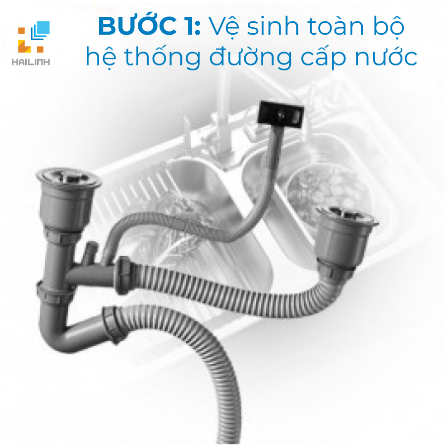 Bước 1: Vệ sinh toàn bộ hệ thống đường cấp nước bằng cách mở van tổng và các van nhánh cho nước chảy trong khoảng thời gian là 5 phút. Việc này giúp đảm bảo cho gia đình bạn có nguồn nước đảm bảo sạch khi sử dụng
