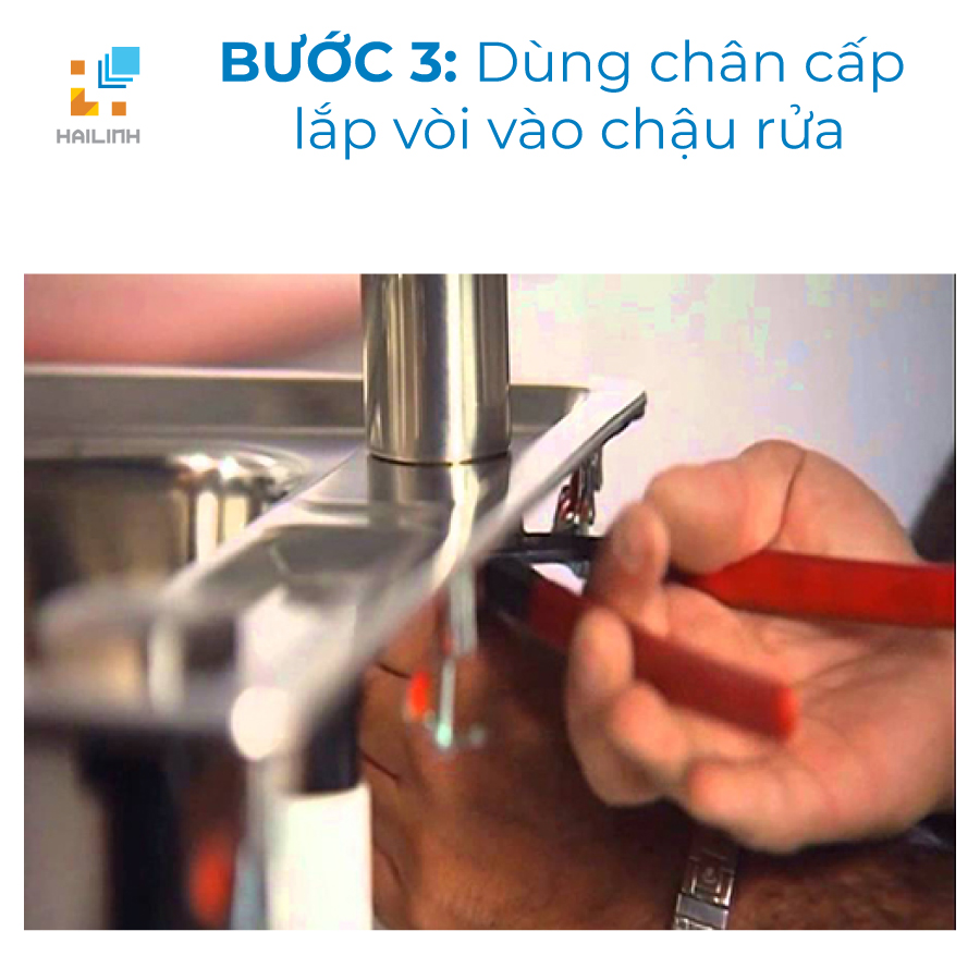 Bước 3: Thông qua lỗ khoét có sẵn trên chậu, dùng chân cấp lắp vòi vào chậu rửa.