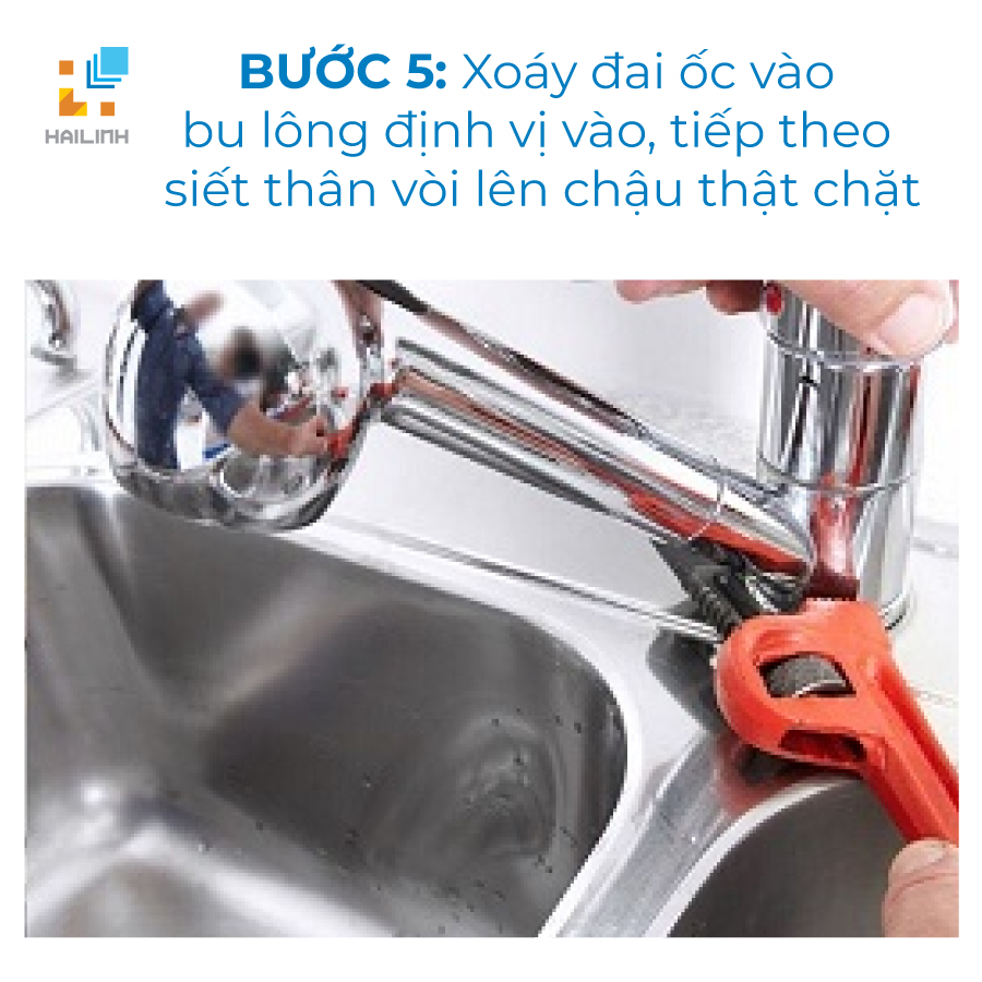 Bước 5: Xoáy đai ốc vào bu lông định vị vào, tiếp theo siết thân vòi lên chậu thật chặt.