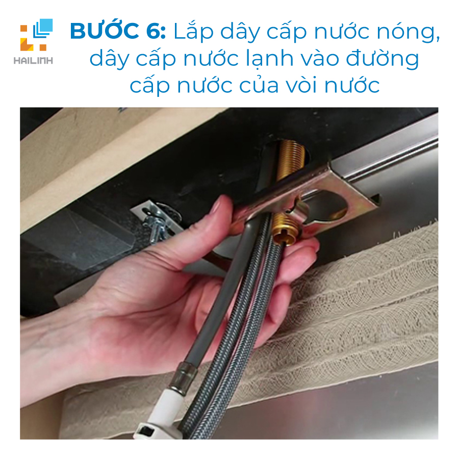 Bước 6: Lắp dây cấp nước nóng, dây cấp nước lạnh vào đường cấp nước của vòi nước.