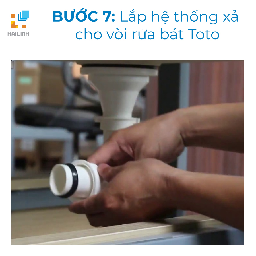 Bước 7: Lắp hệ thống xả cho vòi rửa bát Toto từ phía trên xuống dưới, luồn cả phần gioăng cao su vào ống xả. Sau đó, dùng cờ lê lắp đai ốc và siết chặt các đai ốc lại. Cố định phần thân vòi rửa chén sao cho phù hợp với tư thế rửa.