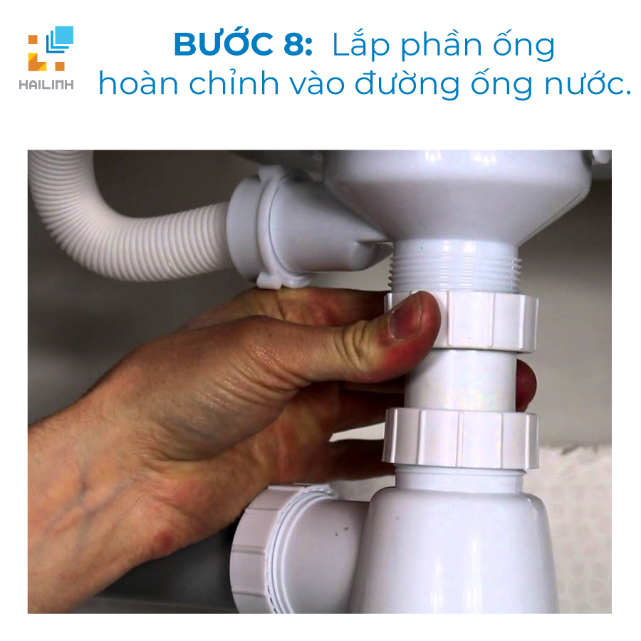 Bước 8: Lắp phần ống hoàn chỉnh vào đường ống nước. Tiến hành xả nước để kiểm tra lại xem đã hoạt động trơn tru chưa hay có bị rò ở đâu thì lắp lại luôn
